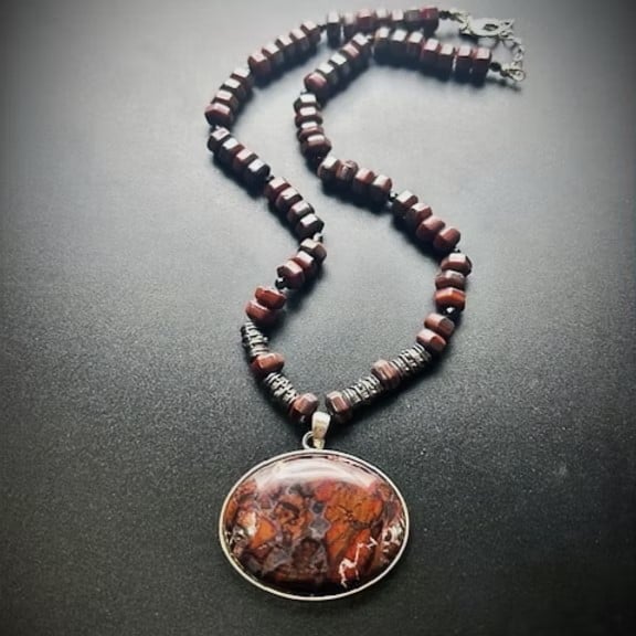 A fiery stone necklace with a red jasper centerpiece and red jasper crystals, handmade with utmost care and devotion. Makes a wonderful statement jewelry piece and brings out emboldening attributes, inner courage, creativity and protective properties. Inspired by the feminine flame of St. Brigid.